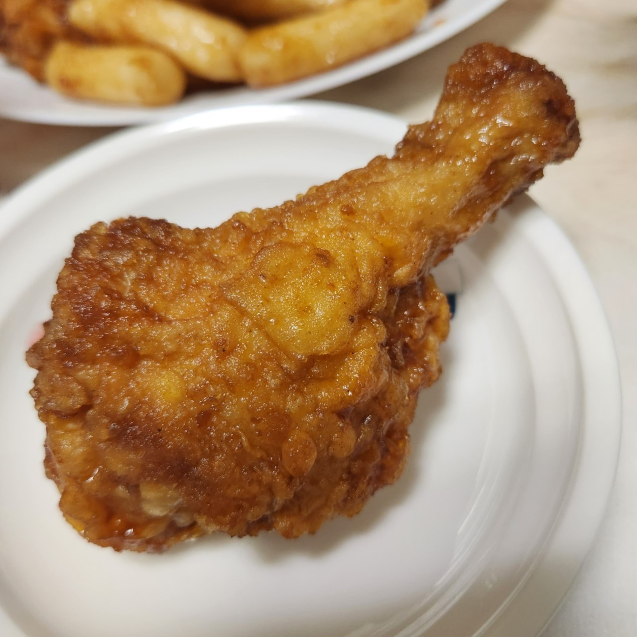 확실히 진한 간장치킨의 향이 식욕을 자극합니다. 제일 좋아하는 닭다리부터 먹어 보니 겉바속촉의 정석입니다. 닭다리살도 풍부해 식감이 좋고 겉은 짭조름한 간장 맛과 속의 촉촉하고 적절한 간이 잘 어울립니다. 살짝 매콤한 뒷맛도 좋습니다.